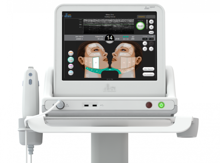治療で使用するウルセラシステムは、高密度焦点式超音波と超音波画像診断機能を組み合わせた「見ながら治療する」という特許を取得しており、安全性と治療効果を約束する革新的な装置です。